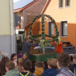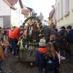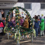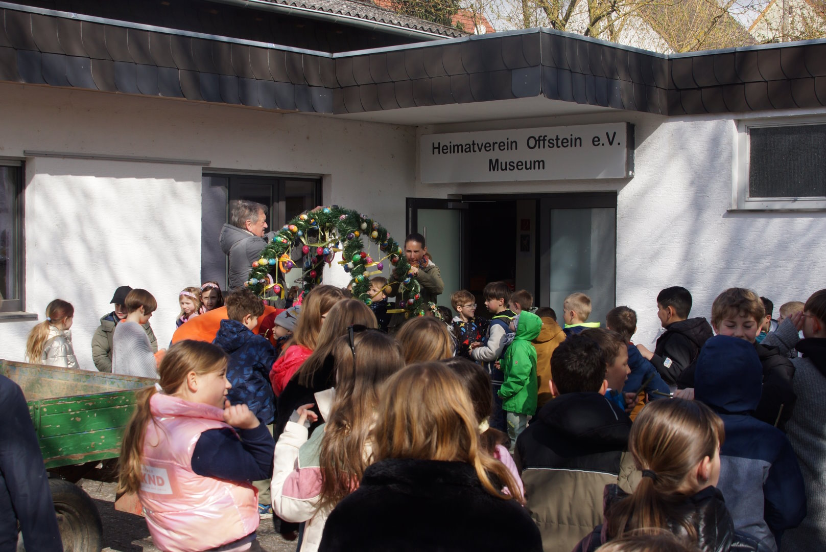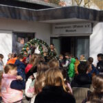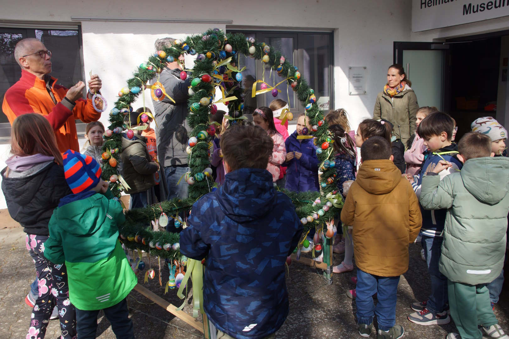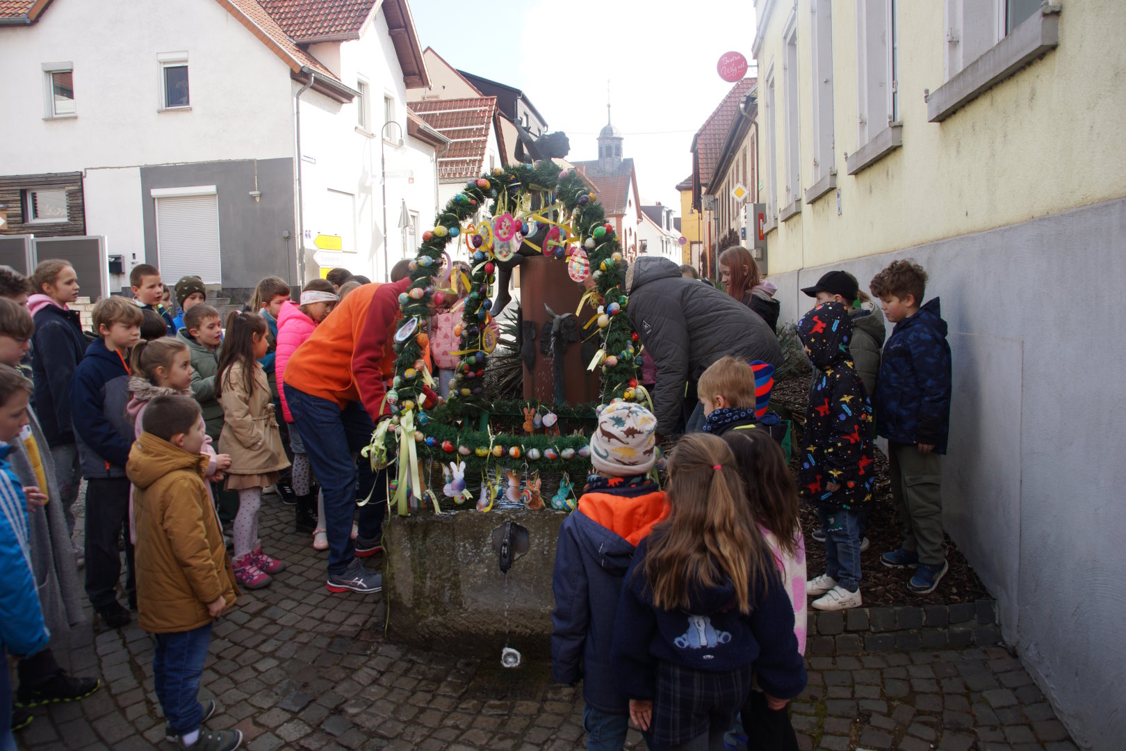 In den Wochen davor hatten die Kinder der Klasse 1a und 1b den neuen Osterschmuck für den Brunnen vorbereitet. Gegen 10 Uhr fanden sich die Kinder der Grundschule mit ihren Lehrerinnen am Heimatmuseum ein, wo schon die Brunnenkrone auf sie wartete. Jedes Kind durfte sich aussuchen, wo sein Ei seinen Platz finden sollte. Nachdem alle Eier aufgehängt waren, wurde die Brunnenkrone von den Kindern zum Flötenspielerbrunnen begleitet, den sie nun bis Mitte April schmücken wird.