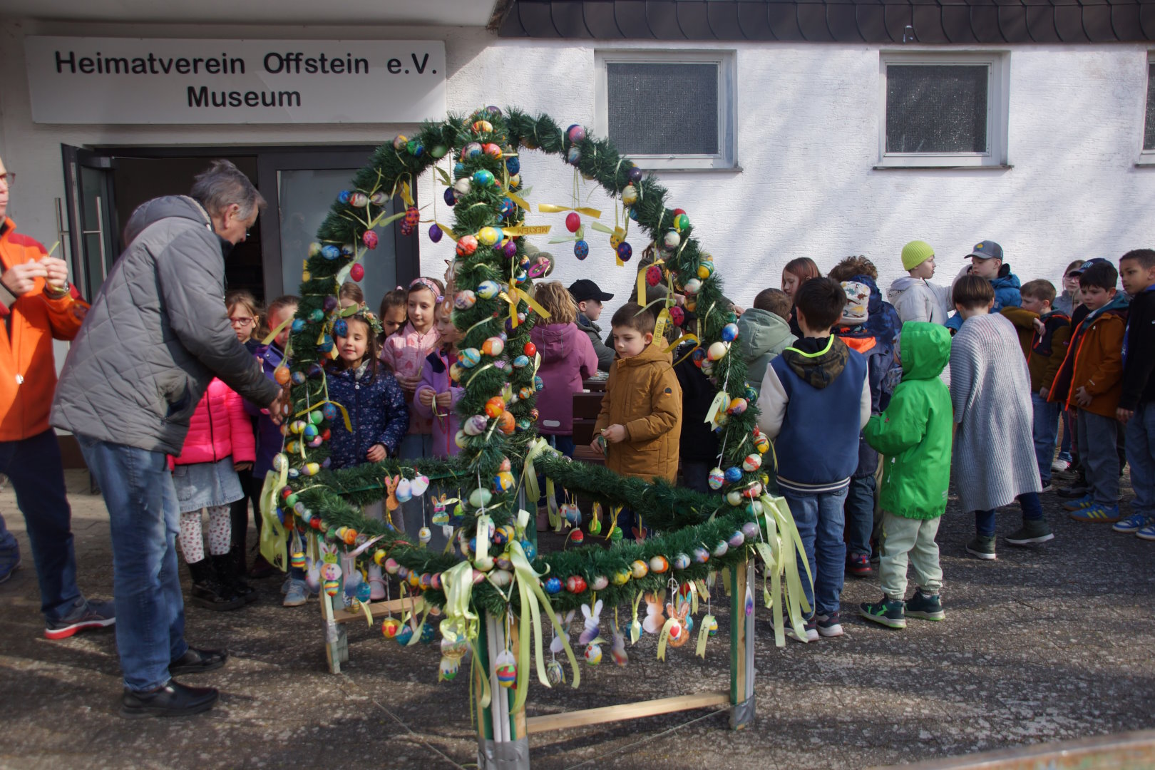 Der Brauch, zur Osterzeit die Brunnen festlich zu schmücken, stammt ursprünglich aus der fränkischen Schweiz und verbreitete sich in den 1970er und 1980er Jahren von dort aus in weitere Regionen. Der Heimatverein pflegt diesen Brauch in Offstein seit 2017. Von Anfang an steuern die Kinder der Grundschule am Engelsberg ihren Teil dazu bei.
